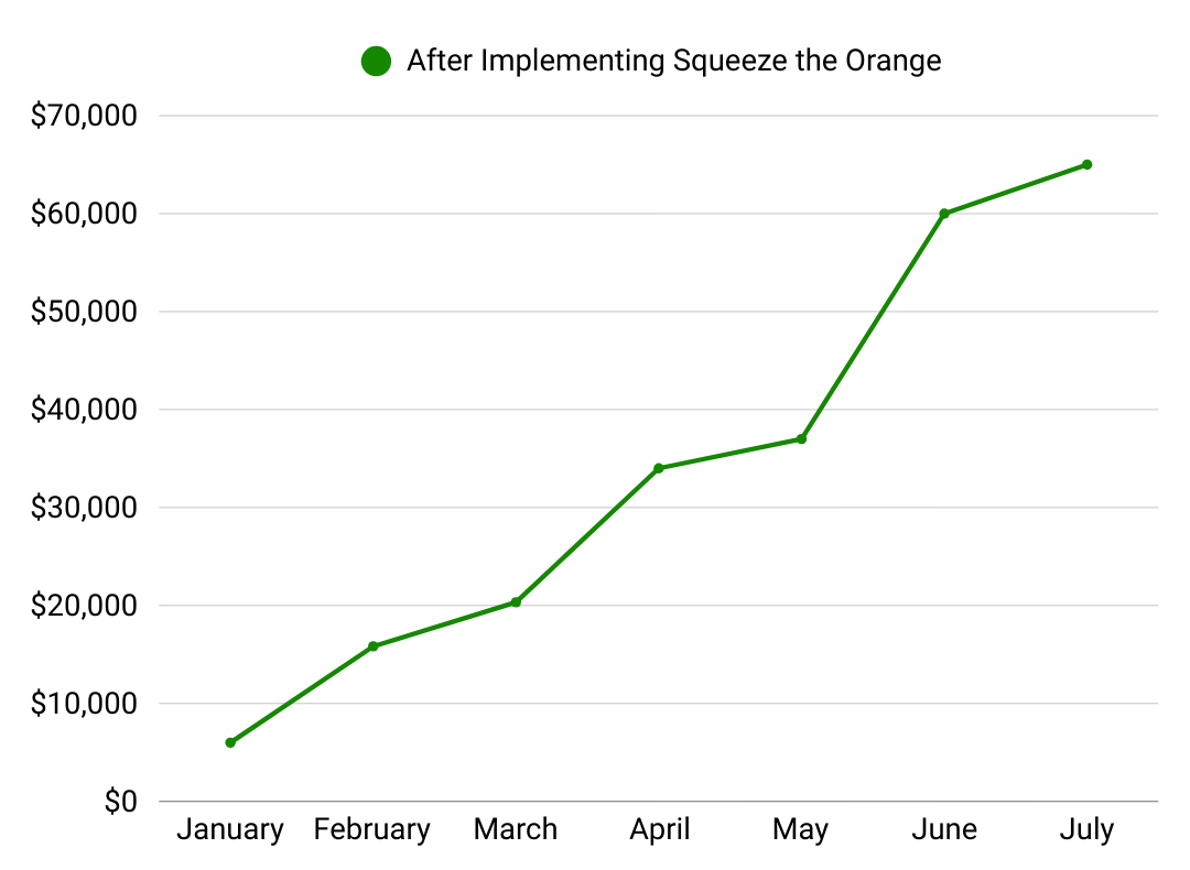 Implemented Squeeze the Orange tactics (much better emails, sales process, and cold outreach) which produced much higher months in sales.
